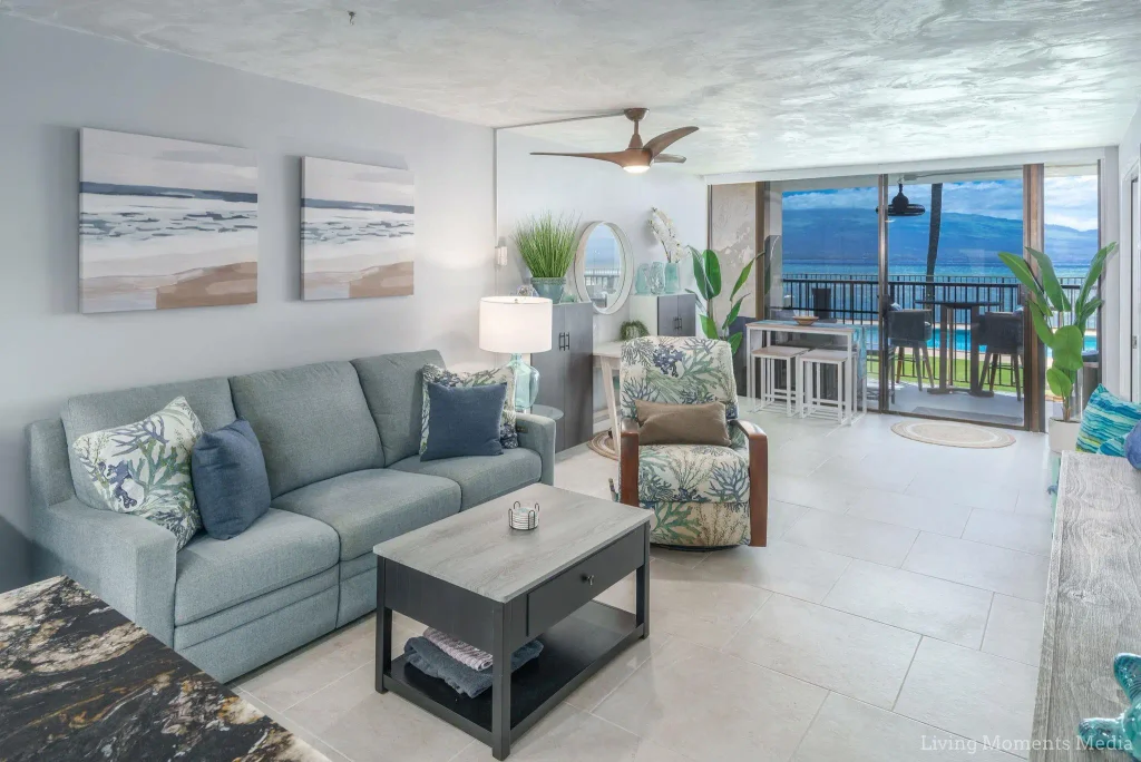 This captivating fully renovated 2 bedroom, 2 bathroom ocean front vacation rental condo will take your breath away! Majestic ocean views from the spacious covered lanai, living room, dining room, kitchen and master bedroom. The best seat in the house for whale watching or catching the sunset. With renovations completed in 2023, this luxury condo offers a dream kitchen, spa-like bathrooms, LG & Samsung appliances, skimmed walls, gorgeous decorative ceiling mural, stylish tile throughout condo & transitioning onto the covered lanai, thoughtful storage added in each room & split A/C. Perfectly situated on the ground floor with easy access to pool & BBQ area. So much thought & care was put into selecting the materials & exquisite décor for this stunning rare gem at Lauloa. Short term rental allowed. Fee simple. Sold furnished.
