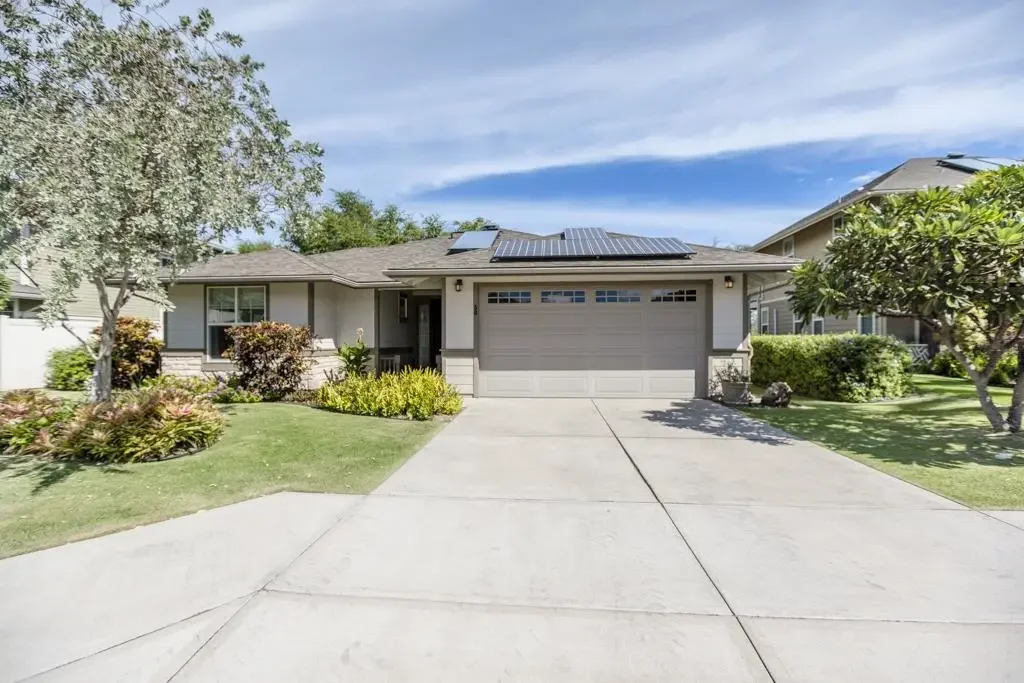 Welcome to 50 Olina Street - your Maui Lani Oasis. Experience the pinnacle of island living in this lovely single level home nestled within the prestigious Parkways at Maui Lani community. Embracing the serene backdrop of the lush Dunes at Maui Lani golf course, 50 Olina St is a beacon of comfort and luxury. This 3bd/2.5ba home boasts the popular Mauna Kea open concept floor plan, ensuring every inch of space is utilized to its fullest potential. 9 ft ceilings and custom 8 ft doors enhance the sense of space and elegance, while an abundance of windows bathes each room in natural light. Recently installed new appliances, new AC Handler in living rm and an advanced Sunbird Irrigation Controller system ensure state of the art living. A large kitchen island stands at the heart of the room, surrounded by spacious living areas that invite memorable gatherings. Stay cool and comfortable with a split AC system complemented by an 18 panel owned PV system with Net Metering to significantly reduce your electric bills. The private back lanai offers magical views of the West Maui Mountains, providing the perfect backdrop for relaxation or entertainment. A roomy three car garage provides generous space for vehicles and storage, fulfilling all your practical needs. Just minutes away from the airport, shopping centers, dining destinations, schools and medical facilities, the home's location combines convenience with tranquility. Your dream of island living awaits at this meticulously maintained sanctuary.