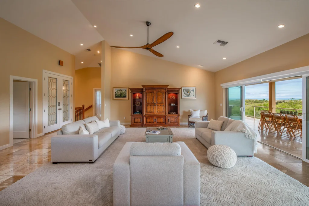 From sunrise to sunset, this private oasis in Central Maui delivers. Expansive ocean, Haleakala, and West Maui mountain views compliment the lush greenbelt bordering this fully-fenced property. Just inside the grand entry staircase is an open-plan great room with soaring vaulted ceilings. The spacious kitchen perfect for entertaining has ample counter space and a walk-in pantry, plus both indoor and outdoor dining areas. Also on the main floor, the primary suite has lanai access and oversize windows to enjoy those epic views. A walk-in closet with built-in storage and a spa bath with dual sinks and soaking tub create a private sanctuary. With over 1000 square feet of covered lanai space on the upper and lower floors, this property encompasses the ultimate indoor-outdoor Maui lifestyle. The high-quality home was thoughtfully crafted for maximum utility with 2x6 solid-core construction, abundant storage, durable monier tile roof, and a finished oversized two-car garage. There’s brand new dual-zoned central air conditioning and a new 38-panel photovoltaic system to keep those electric bills low. Additional enhancements include fresh paint inside and out, new carpeting, new ceiling fans, and new lower-maintenance landscaping with a variety of dwarf fruit trees like mango, banana, citrus, papaya, & lilikoi. Sandhills Estates is a peaceful gated community in the heart of Central Maui minutes from conveniences like shopping, restaurants, the hospital, and the Kahului airport. Schedule your visit to this exceptional offering today!