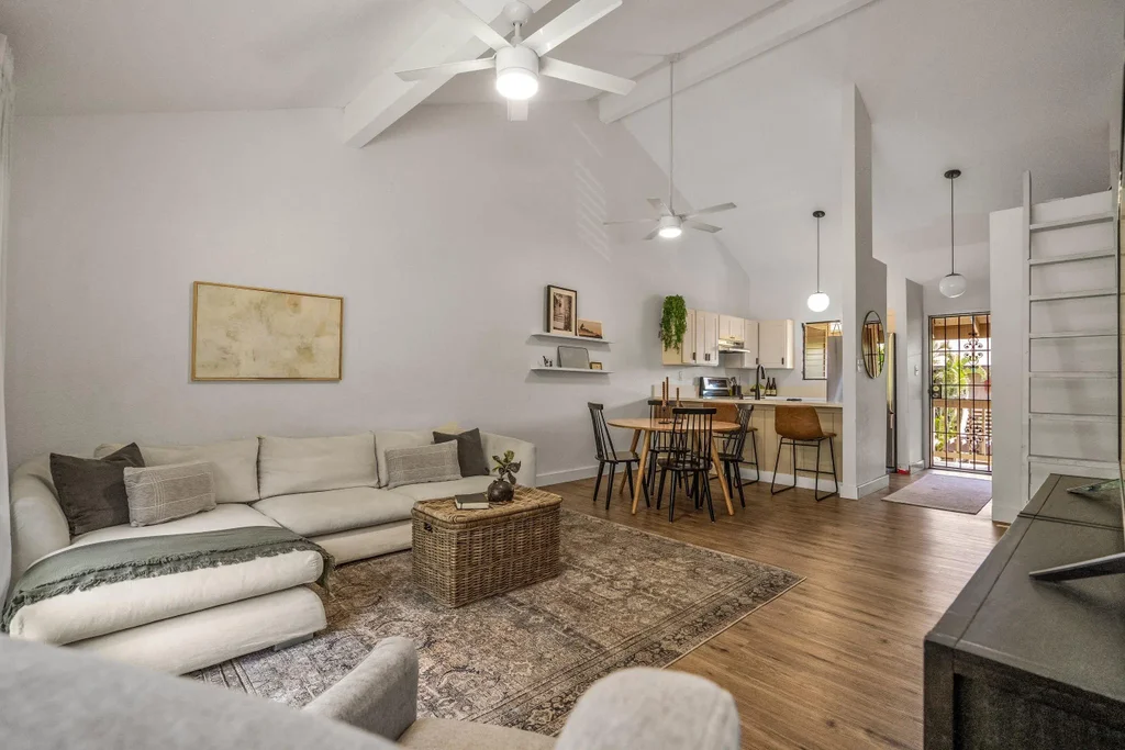 Experience coastal living just steps away from the sandy beaches of North Kihei! High vaulted ceilings grace every room, contributing to the overall sense of openness in this bright and airy 2-bedroom, 2-bathroom residence at Haleakala Gardens. Positioned in a prime location, this unit is on the top floor, boasts a delightful tree-top and garden view, and includes two parking stalls directly in front. This unit underwent a remodel in 2020, featuring premium upgrades such as LVP flooring, quartz countertops, stainless steel appliances, and more. Haleakala Gardens is a pet-friendly community, ideally situated just one block from the ocean, close to Kalepolepo Beach and Waipuilani Beach Park. Whether you're a first-time homebuyer or an investor seeking a rental property for six months or longer, this is an exceptional opportunity.