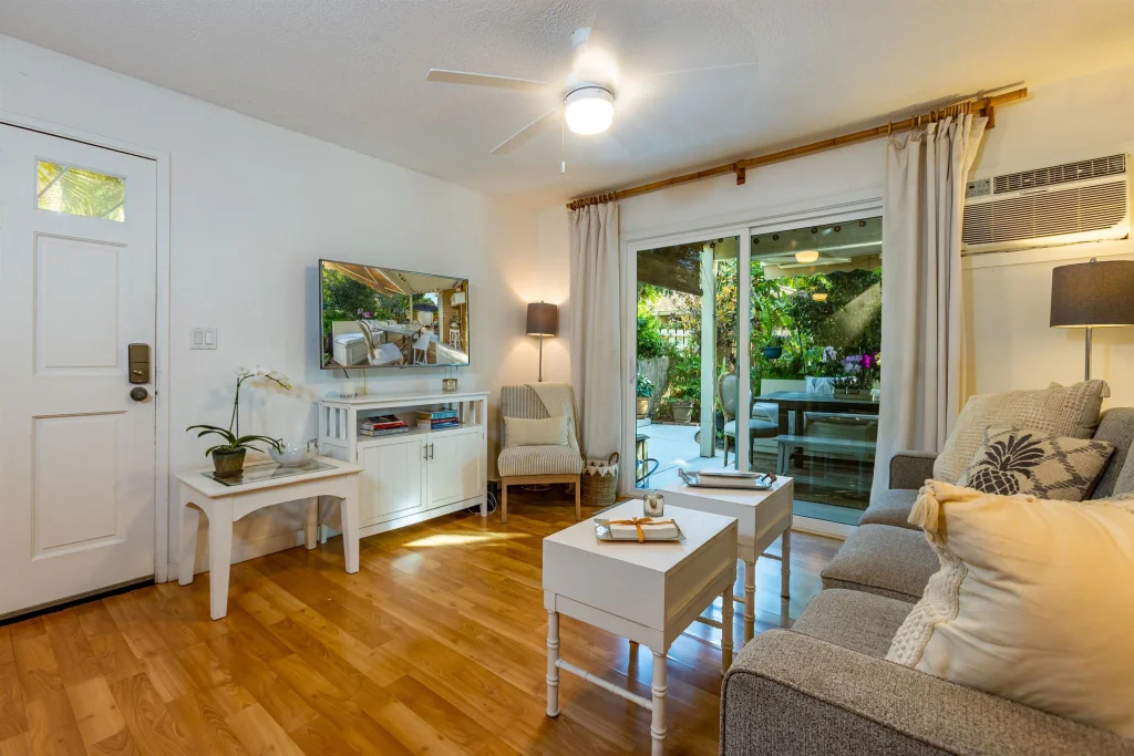 Located in a prime and private location within Kihei Villages, this residential condo presents a captivating blend of indoor and outdoor living, setting it apart. Presenting a meticulous renovation, including but not limited to all new windows and sliding glass doors, fully updated bathroom, new kitchen flooring.. this dwelling welcomes you into a home of refined comfort and practicality. Wood floors, stainless appliances, built-in closet system, oversized washer/dryer are just a few of the many extraordinary features. A turn-key experience with chic furnishings in every room, artwork, fully stocked kitchen, complete bedding and bathroom linens, and other household items ensuring a seamless move-in. Beyond the interior lies a private, expansive outdoor space (over 1,300 sf) that defines serenity. A covered outdoor dining area as well as a comfortable lounge space adjoin a stunning private garden. Perfect for your (allowed) pet to enjoy too, this tranquil sanctuary is accompanied by a convenient storage shed and partitioned area fondly known as “The Board Room”. Assigned parking is just steps away with plenty of visitor parking nearby. Monthly association fee includes: water, sewer, trash, cable, pest control, 24-hour security. A short stroll leads you to the beach, dog park, several active local canoe clubs, while a brief drive opens the door to all your essential island needs. Here, every detail harmonizes to create a living experience that encapsulates the essence of Maui – a haven where modernity meets island living, and convenience meets our coastal lifestyle. This truly is a hidden gem.