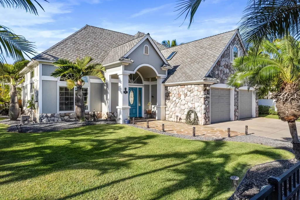 Location is paramount in Real Estate. This becomes evident as you walk the verdant grounds of this expansive 10k+ sq/ft lot in this prestigious community. Backing up to The Dunes at Maui Lani Golf Course, this home is comfortably separated from the fairway with lush vegetation. Cared for and updated by the second owners, this is your opportunity to acquire a distinctive property - one of the few custom homes built in The Greens of Maui Lani. Repose in the recently retiled and spacious lanai. Relish in the unexpected sense of privacy and tranquility. Reflect on the entertaining opportunities in your future. Upon entry, the abundance of natural light is evident, as is the pride of ownership. Soaring ceilings create a loftiness that connects the remodeled modern kitchen, living and dining areas. The thoughtful floor plan offers an extended master ensuite on the ground level, two bedrooms upstairs, along with a full bathroom on each level. A large bonus room/loft upstairs can be used as an office, play area or an additional bedroom. The additional upstairs living area can also be utilized as a work or play space. Functionality and optionality abound in this home. The owned & grid-tied 40 panel photovoltaic solar power system with 2 smart battery backup will keep your home powered. Use the system to cool your residence with the new 5 ton central AC system and heat the large capacity high efficiency water heater. Charge your electric vehicle in the two car garage. Revel in your new Maui home.