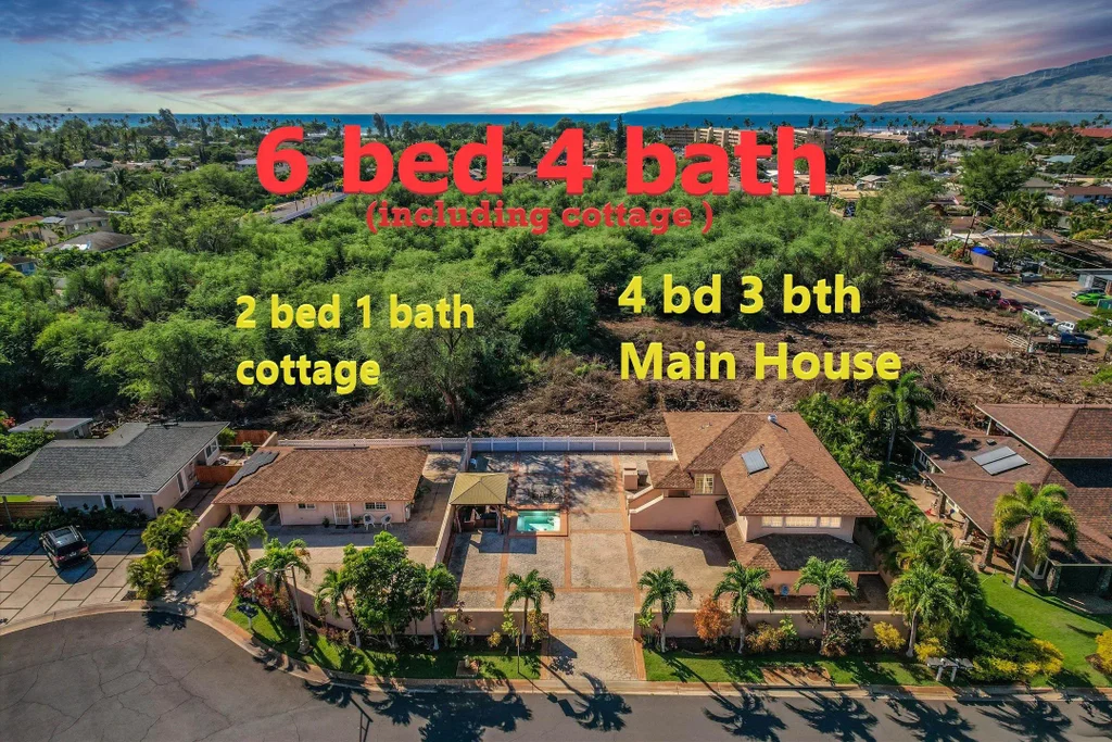 The entire property is now completely vacant. Property Back on the market due to no fault of the seller! Discover the epitome of luxurious living in this stunning residence located at 1079 Kahaapo Loop. Situated on a sprawling 10,750 sq ft lot, this meticulously crafted property comprises a spacious 4-bedroom, 3-bathroom Main House and a detached 2-bedroom, 1-bathroom cottage. The Main House is a testament to quality construction with features such as copper piping, stucco siding, and tastefully Natural Stone tiled bathrooms and flooring throughout. The entire 1st level and entry stairs consist of travertine and the 2nd level floors are 3/4" solid oak plank flooring. All countertops, kitchen flooring, and bathroom flooring are matching granite. The entire yard inside of the 6' stucco wall is 100% concrete with solid pigmented terracotta accent strips that tie in the colors of the property. Stay cool during the summer months with the 2-zone independent AC systems. The upstairs system has a 18 SEER Bosch compressor. The Main House has Solar Panels (owned not leased) that are Net Metered on the grid. The Detached Cottage has both meters on it and the Solar Panels for the Main House are on two sides of the roof on the detached cottage fed into the meter for the Main House, which is on the detached cottage, next to the separate electric meter to the detached cottage. Keep your vehicles protected and cool from the sun in the 2-car garage. The detached cottage has a full-sized kitchen with granite countertops that match the bathroom countertop and all of the100% of the granite tile flooring. The cottage comes with its own separate driveway and fully covered lighted carport and is fully enclosed by 6 ft stucco privacy walls. One might assume the cottage is a separate property, since there is so much privacy and distance between the main house and it even has its own separate address (1081 Kahaapo Loop). The cottage also has plenty of exterior space that is entirely concrete and is perfect for maximal rental income. The cottage comes with its own central AC system. Enjoy the tranquility of Kahaapo Loop, as some call this small, 23 lot subdivision the "Shangri-La" Loop, due to its custom homes and quiet intimate Loop. Lounge out by hot tub and under the gazebo for the ultimate relaxation. This outdoor oasis boasts zero maintenance landscaping, providing a private and serene escape. There is a narrow band of lush tropical plants and grass outside the 6' tall stucco wall for lovely curb appeal. The prime location in Central Kihei, is walking distance along a paved County created path to Piilani Shopping Center, which has the Kihei Safeway. Waipulani Park with beach access, county pickleball courts, the Kihei-Wailea post office, shops, restaurants, and gyms are less than a five-minute drive. Immerse yourself in the comfort and convenience of this meticulously designed property. All appliances and furniture are included at no additional cost if desired.