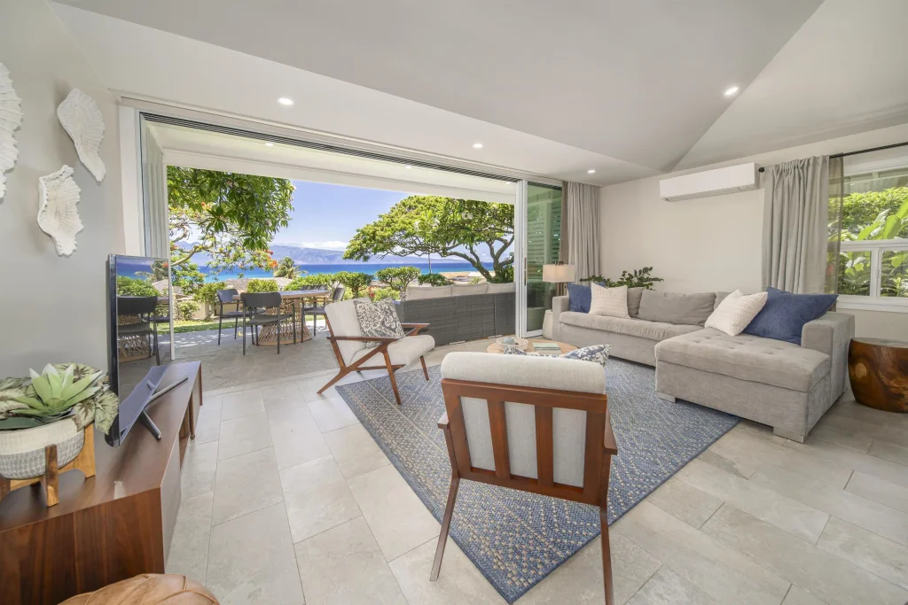 Step into the magic of Alaeloa, a small enclave of 42 private cottages and duplexes situated on the Napili Coast. Alaeloa 44 is a beautiful two-bedroom duplex residence featuring panoramic ocean views anchored by the neighbor island of Moloka’i. With thoughtful renovations throughout, the wonderfully equipped kitchen opens to the dining and living areas. Both the living room and spacious primary bedroom suite feature large sliding windows that stack to allow indoor, outdoor living. The guest suite is light and airy with large picture windows and vaulted ceilings. Enjoy Maui’s stunning sunsets from your spacious lanai. Amenities in this gated oceanfront community include a seaside swimming pool and owner’s pavilion, and an onsite manager. This gorgeous residence is offered fully furnished and turn-key. This is a leasehold property.