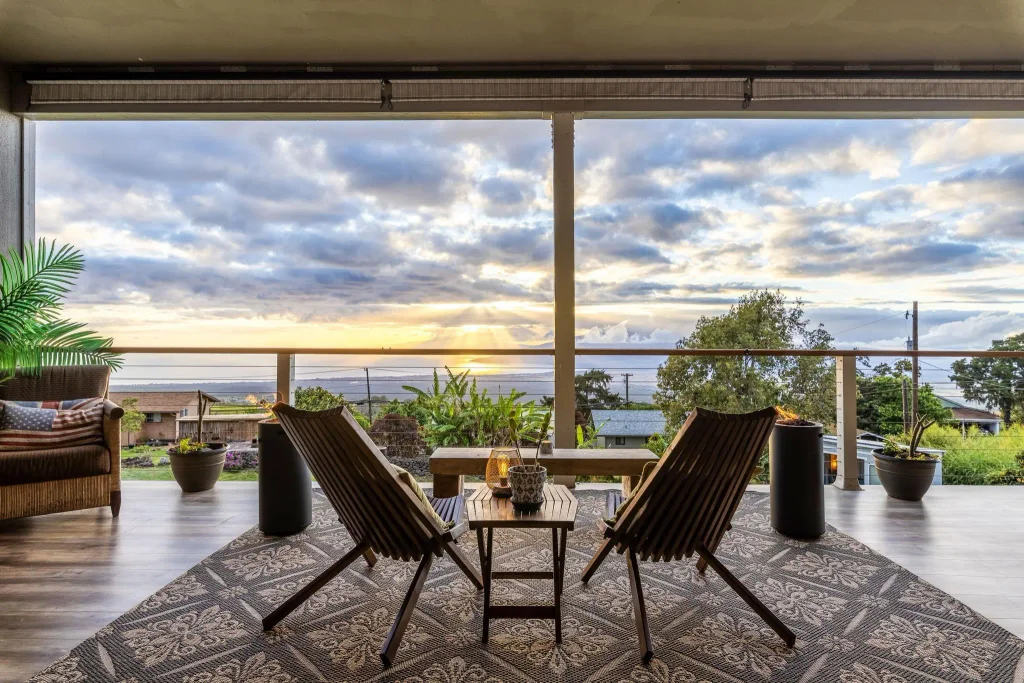 Perched on a beautiful half-acre on the slopes of Haleakala, this custom Kula home offers a modern feel and stunning views from Wailea to the North Shore. The thoughtful design features a cozy living room with gas fireplace opening through 20 ft wide stacking doors to a spacious covered lanai. The 1,423 sf house has 3 main bedrooms plus flexible spaces perfect for offices, a pantry, or a 4th bedroom. Outside enjoy a private fenced deck with hot tub, lounging area, and a small pool. You’ll also find mature fruit trees including bananas, figs and loquats, a gently sloping yard, and handy outbuildings. With agricultural zoning and a water catchment system, this property holds promise for future endeavors. Constructed in 2016 by owners from the home and interior design industry, expect creative touches, top-notch appliances, and meticulous craftsmanship throughout. The water catchment has been successfully used for the last 8 years by the current owners. Completely turnkey and sold fully furnished.
