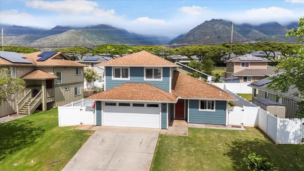 This is a 4-Bedroom 2.5-bath home that features the kitchen, dining, living room, half bath and the primary suite with walk-in closet, double vanity and interior laundry area all on the ground floor. This well-designed residence is situated towards the top of the highly desired Waikapu Gardens subdivision. Enjoy views of the Haleakala and West Maui Mountains from this freshly painted 2-story home that is fully fenced with a spacious 360 sq.ft covered lanai with wrap around sidewalk and extended permitted patio, full rain gutters, landscaped and irrigated, bonus storage shed and two car garage with storage closet and new garage door. Other features include solar hot water heating, owned net metered 20 panel PV system with WARRANTY until 2038, Central air conditioning upstairs, split AC downstairs, new appliances, upgraded guest bathroom with all new tile surround and new bathtub. This home is within walking distance to the community park and playground. A well established neighborhood and in a convenient location to enjoy Wailuku lifestyle, close to schools, hospital, grocery stores, golf and beaches. The monthly association fee includes the trash service for $120/mo. New Survey completed on June 12th. Sold AS IS. Tenant occupied. Buyer to participate in Seller's 1031 Exchange.