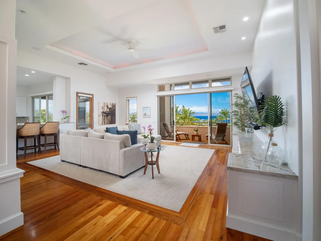 Welcome to 318 Aalii Way, the most private and secure estate within The Kaanapali Resorts. This gated masterpiece is nestled in the prestigious Kaanapali Golf Estates enclave, perfectly situated on the serene Aalii cul de sac, and fronting a double lot, providing panoramic ocean views and spectacular year-round sunsets. A grand double-door entry adorned with a wood inlay ceiling and etched glass sets the tone for the elegance that lies within. The upper level offers seamless single-level living, featuring the master bedroom, formal living room, gourmet kitchen, laundry room, and garage. High-end finishes such as Koa wood and slate flooring, granite countertops, and a chef's kitchen exemplify luxury and sophistication. The lower level is designed for relaxation and entertainment, housing two guest bedrooms on opposite sides, separated by a spacious family room/theater room equipped with a wet bar and refrigerator. The north wing guest en-suite provides direct access to the pool deck and includes its own washer and dryer. The south wing guest suite features Fleetwood glass doors opening to a covered patio. Modern conveniences such as electric drop-down shades, state-of-the-art Hunter Douglas window treatments, and a Sonos sound system ensure comfort and convenience throughout the interior and exterior spaces. The property boasts mature privacy landscaping, enhanced by outdoor lighting and accent features that create a tranquil tropical retreat in the evening. The pool spa and pool deck are easily accessible from the lower family room, offering an ideal space for relaxation and entertainment. A state-of-the-art irrigation and drip system with a Rainbird controller maintains the lush landscape. Additional features include an oversized 2-car garage and a large driveway with space to accommodate up to 7 cars. The home is offered fully furnished with high-quality furnishings, ready for immediate occupancy. Experience unparalleled luxury and privacy in one of Kaanapali's most coveted locations. Welcome to your dream home at 318 Aalii Way. Listor is Owner.