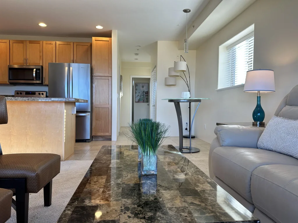 Panoramic ocean/sunset and Haleakala views from this 1 bedroom, 3rd floor end unit at Kihei’s centrally located hidden gem, Walaka Maui — a contemporary concrete and stucco building. Surf? Beach? Hungry? Just a short walk to Cove Park, Charley Young Beach, and the South Maui Gardens. Come home to a beautifully furnished, split air conditioned, fire sprinkled apartment with 2 BRAND NEW bathrooms, newer stainless appliances, full size stacking washer and dryer, window coverings, solar shades and solar panels! Take your choice of parking in your 2 deeded spaces and store all your extra stuff in the large, secure storage room. Elevator in building. Rarely available and a great opportunity!