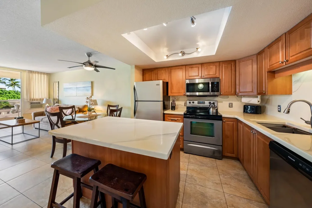 Enjoy beautiful ocean views from this well-located, renovated, 4th floor, HOTEL zoned, Maui Banyan unit! Right across the street from the sand and the surf of Kamaole Beach Park II, Maui Banyan offers the wonderful combination of incredibly easy access to the white sandy beach, while still being very convenient to restaurants, shopping, and more! The beautiful renovation of this 1 bedroom, 2 bath unit included, among other things, new cabinets, Hydrastone countertops in the kitchen, tile flooring, new showers, new bathroom countertops and cabinets, and appliances. Maui Banyan is a highly regarded complex of concrete construction with outstanding amenities like two swimming pools, tennis courts, BBQ areas, covered parking, and more! The maintenance fees include cable, Wi-Fi, trash, water/sewer, onsite security, exterior insurance, and maintenance. This is a great opportunity to obtain an outstanding unit!