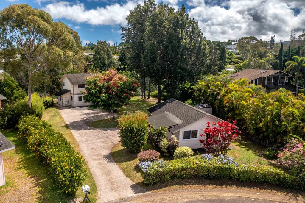 Best location ever in Makawao! Huge, RURAL parcel on a large, quiet cul-de-sac in Upland Estates. A RARE income producing home PLUS cottage with a magnificent yard and glorious trees. The covered lanai upstairs overlooks a quiet and small gulch out back. Amazing breezes cool both the upstairs and down. The flexible floorplan includes 2 upstairs bedrooms, 1 bath, and an identical layout below. The upstairs features a fabulous open beam ceiling and a 2nd small lanai overlooking the inviting front yard. All the floors are tiled. The 2 bedroom, 1 bath detached cottage is really lovely and is nicely separated from the main home. This amazing setting is convenient to town and is a generous .66 acre parcel with an incredible, huge, cul-de-sac location. A beautiful offering Upcountry.