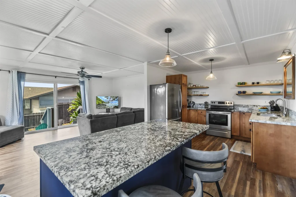 Welcome to the home you’ve been dreaming of! Nestled in a charming neighborhood of the picturesque North Shore surf town of Paia, this updated residence offers breathtaking ocean and mountain views, featuring a flexible floor plan split into two units: a 3bedroom, 1.5bathroom unit and a 1bedroom, 1bathroom unit.. Enjoy your morning coffee on the lanai, taking in stunning ocean and West Maui views, and unwind in the evening with perfect sunset vistas. At the back of the property, you’ll discover a versatile detached studio/office, along with an outdoor kitchenette and living area—perfect for BBQs, entertaining friends, or enjoying a peaceful retreat. The home showcases high-quality waterproof vinyl plank flooring throughout, coffered ceilings with crown molding, solid wood cabinets, and elegant granite countertops. You’ll love the custom monkeypod floating shelves, spacious kitchen island, and stainless steel appliances. The outdoor bathroom and shower boast unique pebble flooring and boat wood-inspired slat walls. Embrace the vibrant lifestyle of Paia, where stunning beaches, surf culture, eclectic shops, diverse dining options, and schools are all just a stroll away. Experience the best of Maui living right at your doorstep!