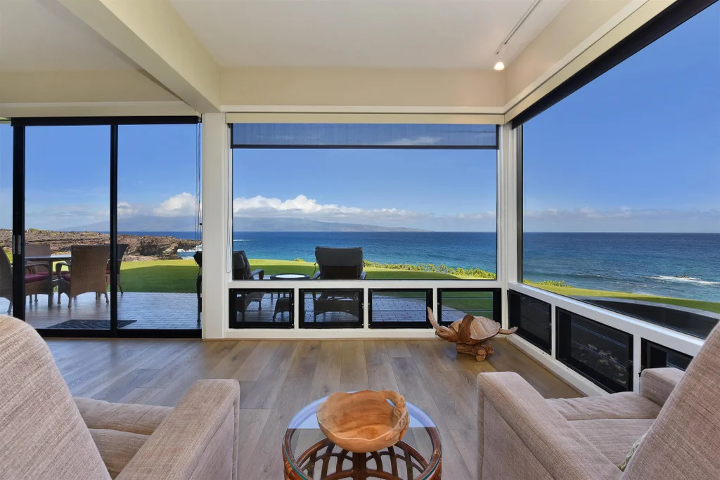 Arguably, the best located unit at the Kapalua Bay Villas, this ground floor luxury condominium, in building 22, is located the closest proximity to the ocean, and been updated beautifully. Attention to detail in all of the finishes, makes this dream home a place in which you, and your family will enjoy for years to come! The enclosed lanais, gives you a glass covered atrium feel, which gives you a fantastic extra covered space, in which you may take in the surrounding beauty of this pristine location. It does provide extra square footage in the living room, as well.. The Main Suite sits along -side the living room and kitchen, facing the ocean front. It’s a wonderful way to wake up, any day!!! Both of the bedroom suites sit alongside the main living area, providing ocean views, and private lanais!! The views are absolutely breathtaking, and encompass Honolua Bay to the North, so you can check the surf at a glance, Havea Point, the channel, as well as the Friendly Isle of Molokai as a backdrop. The flooring has recently been updated to a white oak Luxury Vinyl in the living room, and dining area, and bedroom suites. Walk out to your extended tiled lanais, and put your feet in the beautiful lawn in front of the unit. The owners above this unit, have owned for many years. They only use it for personal and family, so it is seldom occupied, and very quiet, when it is. Kapalua Bay Villas are a gated community, and boast an extremely private, and serene environment. The Kapalua Bay Villas are surrounded by some of the most fabulous beaches on the planet, including Kapalua Bay, Napili Bay, Flemings Beach, and of course, if you love to surf, Honolua Bay. Fine dining, world class golf courses, tennis and pickle ball courts, hiking on nature trails, and enjoying the cleanest air on the planet, are just a few of the wonderful benefits to this home ownership. This unit is in a busy vacation rental program. Viewing is limited to availability. Some of the seller’s personal Art work is excluded. 2023 and 2024 YTD incomes attached under documents. Sellers may wish to enact a 1031 Exchange, at no cost or risk to the buyer. Association Documents found under Documents in this listing.