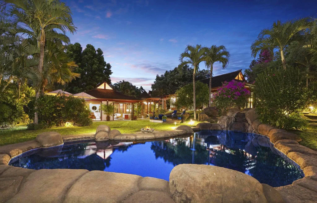 It is one of the most unique and inspiring properties ever offered in Maui Meadows. An exotic four-bedroom, 3.5-bathroom Balinese-style home surrounded by lush tropical landscaping, a cobblestone meditation garden for quiet reflection, waterfalls, and many tropical fruit trees. In-ground pool with an extensive spa, outdoor bar, and barbecue area for entertaining. Beautiful finishes throughout the home; spacious kitchen with honed quartz countertops, a Wolf gas stove, and Subzero refrigerator. Granite countertops are in all bathrooms, and stone, acacia, and teak wood floors are throughout the house. There are so many special touches that contribute to the exotic feel of the home. Included is an adorable Guest Hale with a private patio and tropical outdoor shower- high open beam ceilings throughout the house, and a private gated detached Cottage Ohana currently rented. The indoor/outdoor tropical living experience creates a sense of spaciousness and privacy. You must see it to believe it!