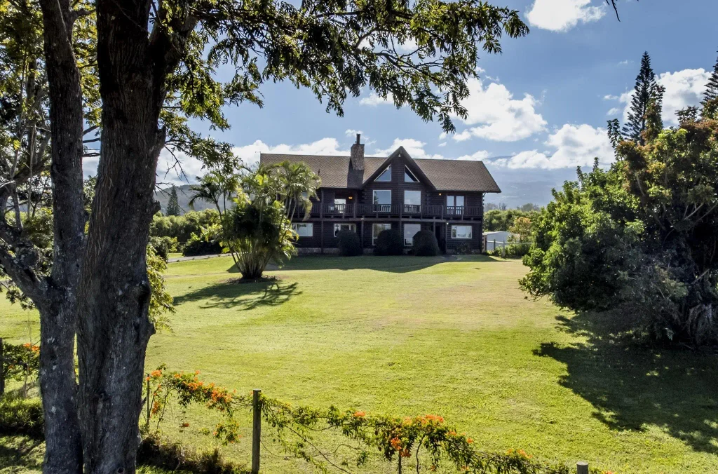 This unique 2,784 sq. ft. western red cedar log home in Haiku, Maui, offers unparalleled elegance and breathtaking 360-degree views of the North Shore Ocean, West Maui Mountains, and Haleakala Crater. This 3-bedroom, 3-bath residence sits on a pristine complete 2-acre manicured lot located in a quiet secluded cul-de-sac - it is all ready for a CPR by a new owner. The primary suite is upstairs on the main floor, and it is adjacent to the main living room, dining room and huge kitchen. You enter via the custom-built staircase, greeted by very high cathedral ceilings, wood-burning fireplaces on both floors, and several hand-crafted stained-glass windows. The downstairs level has a separate bedroom suite with its own bathroom, a third bedroom or study, and another living room area and a shared third bathroom! The interior features Alaskan yellow cedar floors, natural slate flooring, and an abundance of oversized double-pane windows that provide plenty of natural light. The gourmet kitchen boasts granite counters, a large island with a built-in Dacor range, maple cabinetry, and a 48" Kitchen Aid refrigerator. Other amenities include a dumbwaiter from the garage to the kitchen, central vacuum, solar water heater, and Kohler bath fixtures. The bathrooms are adorned with soft-toned Saltillo tiles, floor-to-ceiling tumbled-marble walls, and granite and marble counters. An all-wood spiral staircase serves as both an engineering feat and a work of art. Outside, copper gutters and a 700 sq. ft. oversized garage complete the property. The lot is all useable and the gardens feature an arboretum of native Hawaiian plant species fenced in its own pasture area, and a host of other fruit trees including: avocado, citrus and surinam cherries, along with star fruit, mango, loquat, acerola and white sapote. Call your favorite Realtor today to book a private showing!
