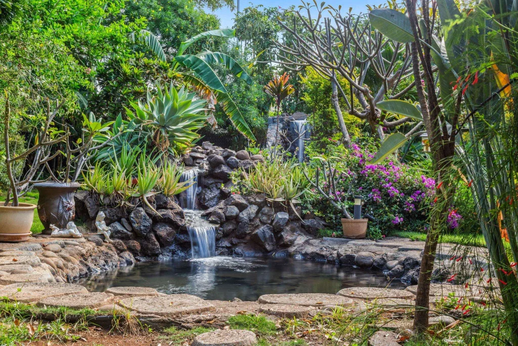 Discover this beautiful 3 bedroom 2.5 bath home in Kihei on a peaceful cul-de-sac, with a gorgeous backyard designed as a private oasis with a cascading waterfall, and another waterfall/pond to sit in and enjoy on a hot Maui day. This residence combines indoor and outdoor living, opening to a lush, resort-like yard with plumeria, birds of paradise, fruit trees, waterfalls, and ponds for ultimate privacy. Nestled in Piilani Village, the home features spacious lounging areas, a modern open kitchen, vaulted ceilings, and split air conditioning for your comfort. Just minutes to Kihei’s dining, shopping, and breathtaking beach sunsets. Don't miss out on this one of a kind home!