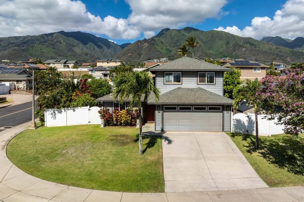 Majestic West Maui Mountain and Haleakala views from this prime corner lot in Waikapu Gardens, one of Central Maui’s most desirable neighborhoods for convenience, schools, and community! This beautifully remodeled four-bedroom home enjoys vaulted ceilings, loads of natural light, and extra sliding glass doors for the ultimate indoor-outdoor lifestyle. Lovingly planted over the years with flourishing fragrant florals and producing fruit trees like citrus, guava, avocado, banana, pomegranate, and mango, the ultra-private backyard is one of the largest in the neighborhood and lives like a serene oasis. Fully fenced and gated, the yard features a bbq & dining patio, outdoor shower, and storage sheds for garden tools and all the water toys! Back inside, the remodeled open kitchen with quartz countertops and stainless steel appliances is the perfect place to prepare home-grown meals. One of the biggest benefits of this floor plan is the ground floor primary suite with a walk-in closet, dual-sink vanity, and spa shower. There’s also a separate laundry and storage room on the ground floor, freeing up extra storage space in the garage and room to park a truck! The upstairs bedrooms are a great spot for a surf check due to the North Shore ocean view, and they stay cool on those warmer Maui days from a brand new central AC unit. Split-system AC cools downstairs. This exceptional Wailuku home is easy to show. Call your realtor to schedule a showing today!