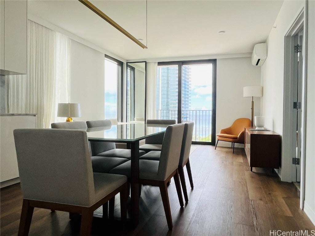 This unit comes with a frontal ocean view on the diamond head side of the building. Developer's fully furnished package. The kitchen is equipped with Bosch appliances and Studio Becker cabinetry. 42nd floor features a sky lounge and gym with 360 degrees views of ocean and mountain, perfect for relaxing, entertaining and parties. The 8th floor amenity deck includes standard and kids pool, indoor/outdoor party rooms, BBQ areas. Steps from Ala Moana Beach Park, Whole Foods, Ala Moana Shopping Center, movie theaters, restaurants, retail stores, farmers markets, parks and beaches. Tenant occupied. Lease ends December 2025.