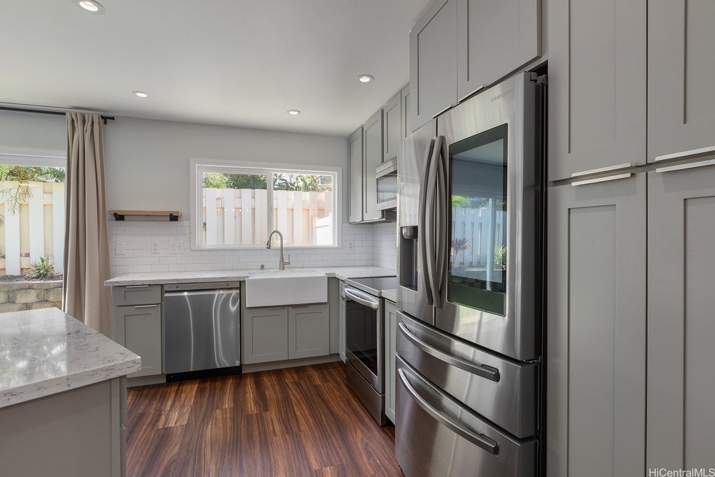 Step inside to a bright, open layout with large windows that fill the space with natural light. The living area is versatile and welcoming, ideal for both relaxation and entertaining. Modern vinyl flooring is stylish and easy to maintain. The kitchen is a chef’s delight, equipped with contemporary appliances including a dishwasher, disposal, microwave hood, range/oven, and refrigerator. Split-system air conditioning ensures year-round comfort, while updated blinds add privacy and energy efficiency. Each bedroom offers ample closet space and peaceful views. The two full bathrooms are tastefully updated for convenience. Additional features include a washer and dryer, an auto garage door opener, and a solar PV system for eco-friendly living and lower energy costs. Ewa Beach is a family-centric community for an active lifestyle. Enjoy sports leagues, fitness classes, and outdoor activities year-round. The new Wai Kai complex offers a range of water sports, dining, and entertainment options, while the Ka Makana Alii shopping center provides a diverse array of retail and dining choices. Schools include Holomua Elementary (PK-6), Ilima Intermediate (7-8), and Campbell High School (9-12).