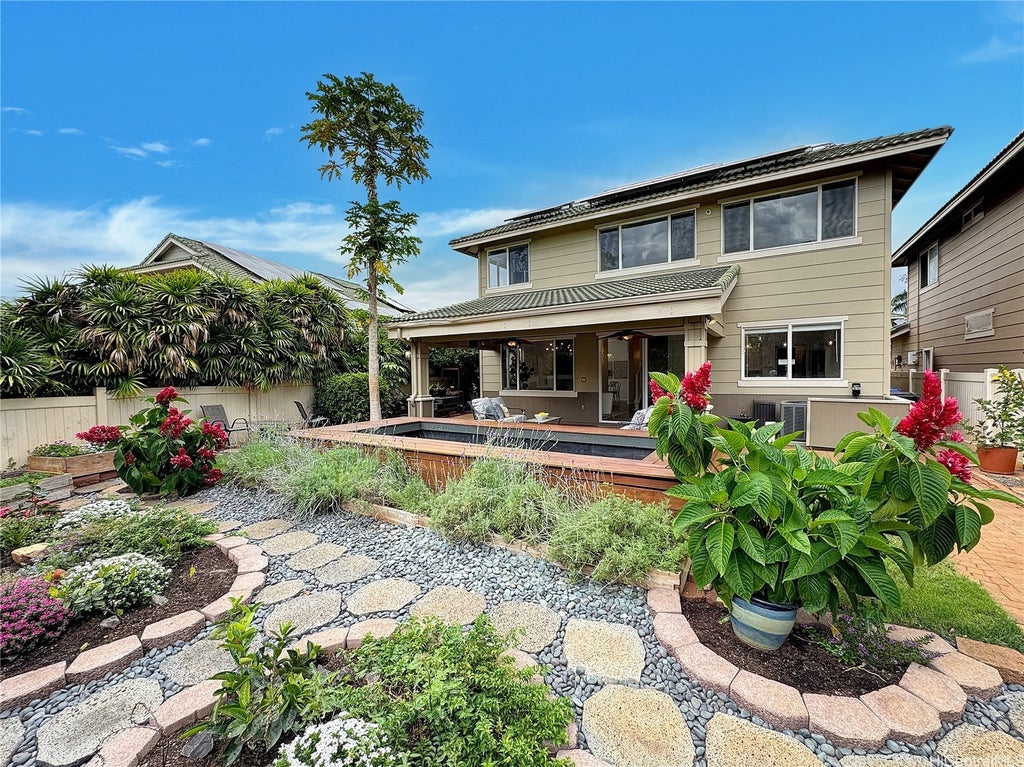 Welcome to your dream home with a VA assumable mortgage at 2.25% and $618,000 balance in the prestigious gated community of Hu'elani, with stunning views of the Coral Creek Golf Course. Enjoy resort-style amenities, including a community pool, hot tub, gym, and clubhouse—perfect for social gatherings. This 3-bedroom, 2-bathroom home offers 1,934 sq ft of luxurious living space. A convenient ground-floor bedroom and full bath make it ideal for guests or multi-generational living. The formal dining room could easily be converted into a fourth bedroom. The upgraded kitchen features custom cabinetry and a bar, perfect for culinary enthusiasts. With an owned 22-panel photovoltaic system and central A/C, this home is energy-efficient and comfortable year-round. Additional highlights include custom pantry shelving, a 2-car garage, and spacious walk-in closets. The serene backyard boasts a large lanai, pond, and zen garden—perfect for relaxing and enjoying the views. Experience upscale living in this exceptional property!