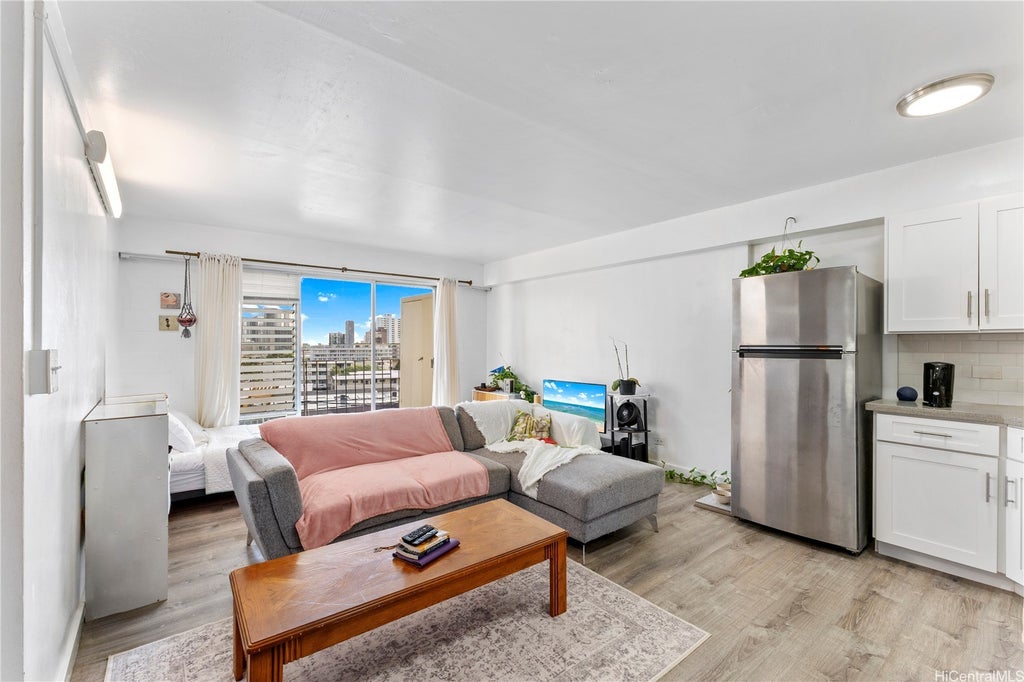 Views of Honolulu City Lights from the top floor of Makiki Iki, a boutique condominium across from Makiki Park and near Makiki Shopping Village. This studio unit has a large lanai stretching the length of the residence where you can relax and enjoy the sights of of the city. Features a remodeled kitchen and bath with quartz counter tops, hardwood cabinetry, new appliances & fixtures and luxury vinyl flooring throughout. Inside the unit is a stacked front-load washer and dryer along with a window air conditioner. A well-maintained building with an elevator and 1 assigned parking stall for your unit. Minutes to University of Hawaii at Manoa, Punahou School, and Ala Moana Shopping Center.