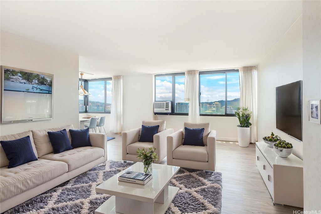 Welcome to Windsor #4302 - a rarely available high-floor unit offering breathtaking panoramic views of the ocean, Diamond Head, Mountains, Friday Fireworks show and sparkling city lights from every room. This 2-bedroom, 2-bath residence comes with the convenience of a full-size kitchen, split AC, and in-unit washer/dryer and 2 conveniently located parking stalls. A huge walk-in closet and storage room are very useful as well! The Windsor is a secure, pet-friendly building with resort-style amenities including a rooftop sky deck, swimming pool, fitness center, BBQ area, and more. Just minutes away from Waikiki beach, Ala Moana Shopping Center, fine dining and a super market. Don't miss this opportunity to own a piece of paradise in the sky! One or more photos have been enhanced.