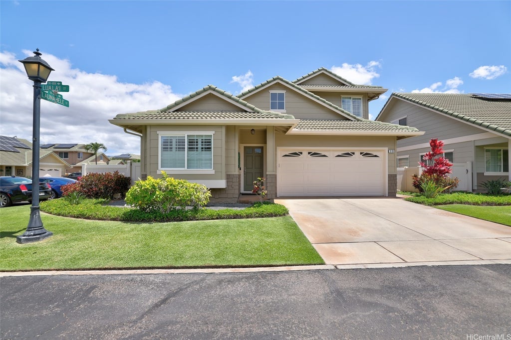 Welcome Home to Hu'elani's prominent & desirable gated community! As you enter this lovely Home, you will find the first bedroom and full bathroom, followed by an open-concept kitchen which leads to the dining and living room, and a large outdoor patio. To the right of the living room is the elegant primary suite, which features a remodeled shower, vanity, and countertop, along with a spacious walk-in closet. As you ascend to the second level, you enter a bonus space that features an extended closet perfect for multi-generational living. Adjacent to this is the third full bathroom, a sizeable third bedroom, and a massive deck. The Home features black stainless appliances, a reverse osmosis water filter, a water softener, a built-in office cabinet, central and split A/C, plantation shutters, ceramic tile, laminate flooring, soft-to-the-touch wall-to-wall carpet, a spacious laundry room, 33 owned PV panels, an enclosed yard, a 2-car garage, 2-car driveway parking, and next-door guest parking. Hu'elani amenities include security cameras, secure entry, water and sewer, house painting, roof maintenance, landscaping, a pool, spa, gym, recreation center, ample guest parking, and more!