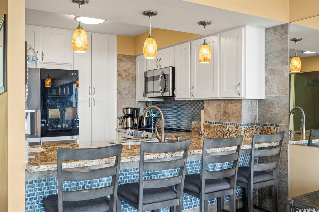 Discover elevated island living in this FULLY RENOVATED AND FURNISHED 1-bedroom unit at the Makaha Valley Towers, offering breathtaking, unobstructed views of the ocean and mountains framed beautifully by floor to ceiling sliding glass doors. Unit 733 is designed with sophisticated style and comfort in mind. The unit features beautiful golden crystal granite countertops set on soft close bright white cabinets in both the kitchen and bathroom. It is enhanced with luxury vinyl plank flooring throughout, pairing perfectly with warm, earth-toned colored walls, adding depth and serenity to the space. The kitchen boasts top-tier stainless steel appliances, and the unit is turn key with high-end furnishings all throughout. This unit features top of the line upgrades, with no corners cut! This is the one you've been waiting for! In addition, the central A.C, water, sewer, electric, cable and internet are wrapped in the monthly maintenance fees. It doesn't get better than this! Come and make unit 733 at the Makaha Valley Towers your home today!