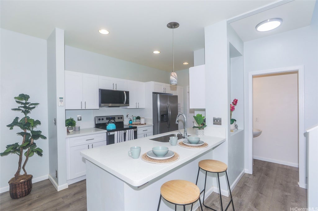 Discover refined island living at Laulani Tides by Gentry in Ewa Beach. This 4-bedroom, 2.5-bath residence has been thoughtfully designed for both comfort and sophistication. A newly installed, never-used kitchen anchors the home with fresh finishes, complemented by durable vinyl plank flooring throughout the main living spaces. Central A/C ensures year-round comfort, while the spacious primary suite offers a private retreat with generous proportions. Practical luxuries enhance daily life, including a third parking pad, a low-maintenance yard, and a garage outfitted with premium Gladiator storage cabinets. Perfectly situated near Laulani Village Shopping Center, residents enjoy seamless access to shopping, dining, and conveniences, all within minutes of home. Blending style, functionality, and an enviable location, this Laulani Tides residence embodies a modern island lifestyle. ASK US ABOUT VA ASSUMABLE DETAILS.