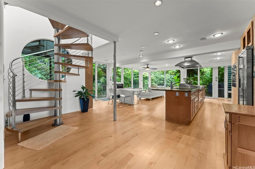 A hidden gem in the rarely available Nuuanu Dowsett neighborhood, shrouded by the vibrant greens of surrounding flowering trees and trickling au'wai, awaits you! Tucked into the crook of a peaceful cul-de-sac, stepping into this home feels like entering the pages of your own storybook. Venture into the expansive main living space, open-concept layout featuring a cozy sitting area with built-in glass shelving and a drop-down projection screen, a designated dining area, and fully equipped kitchen—complete with bartop seating, oversized countertop, and designer appliances—waiting for a home chef to bring it to life. Artistically customized stonework throughout, rich wooden cabinetry, and a built-in sauna make this home extra special. Follow the spiral staircase up to the 4 bedrooms (all en-suite) and imagine yourself in bed, lulled to sleep every night by calming sounds of the Nu'uanu stream and views of the palms swaying in the breeze. A home gym with separate entry and 1/2 bath, Ipe deck with cable railing system, and landscaped front yard elevate this house to a true sanctuary, not to be missed, just a few minutes drive from Pali Highway, Oahu Country Club, and downtown Honolulu.