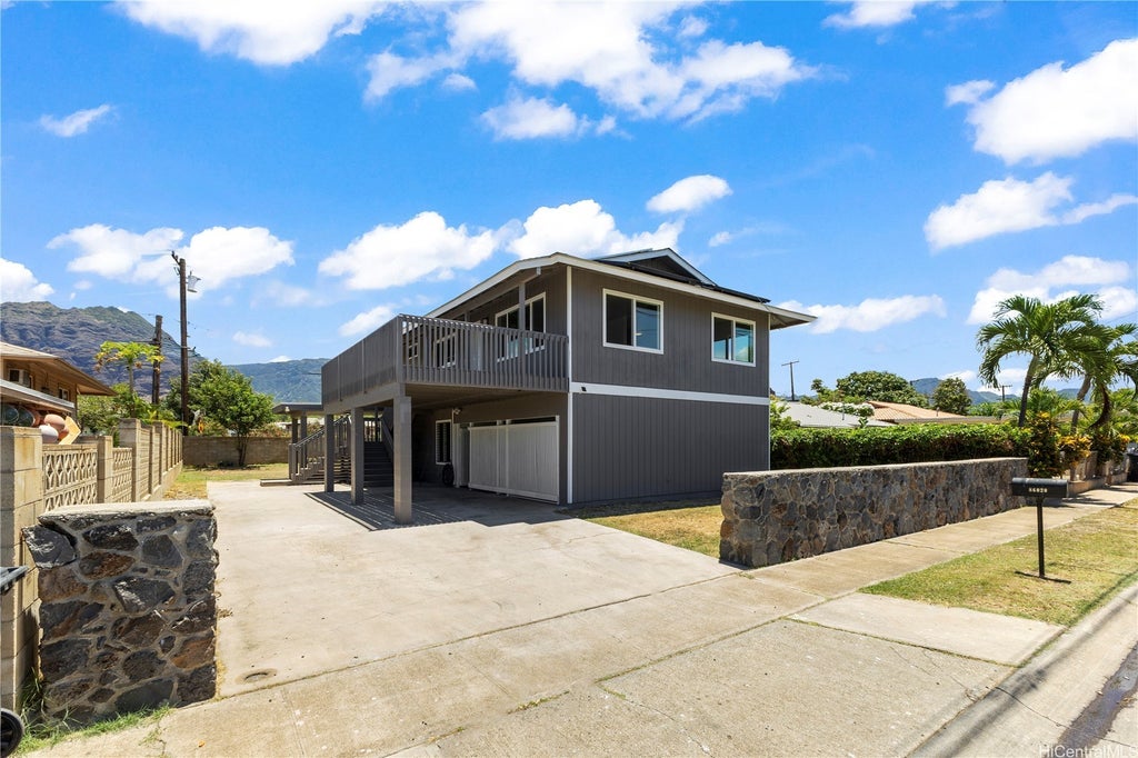 Newly renovated residence a few blocks from Pokai Bay and Lualualei Beach Park with views of the Waianae Range. This 5-bedroom 3-bath home originally built in 2002 has a versatile floor plan with 3-bedrooms and 2-baths upstairs and 2-bedrooms and 1 bath downstairs each with their own entrance. The large enclosed carport can be utilized as a recreation area and provides additional storage along with a laundry sink and side-by-side washer and dryer. The 2 car covered tandem stall and the long driveway provides ample parking. Relax on your second floor lanai or in your spacious fenced backyard. Features granite counter tops, hardwood cabinetry, stainless steel appliances, ceiling fans, and new paint throughout. A 24 panel owned photovoltaic system and solar heater will keep your home running efficiently. Minutes to Tamura Super Market, Waianae Mall, and popular local shops and restaurants.