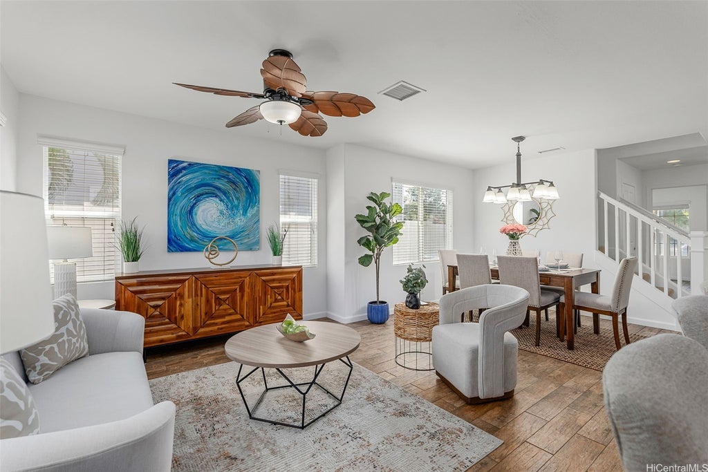 PICTURE THIS: Waking up in your spacious primary bedroom, sunlight filtering through the windows as the gentle trade winds carry the sound of ocean waves and the distant thwack of golf balls from the championship Ernie Els golf course. Picture yourself entertaining in your private, landscaped backyard or unwinding inside where cool AC and porcelain tile floors maintain a cool atmosphere. Your 14 solar panels and battery storage working in the background, keeping electric bills low. Also, the ideal layout offers a full bedroom and bathroom on the main level-ideal for guests, flexible living, or enjoying single-story convenience. Security system ready for you to rest easy. Located in the desirable Kuapapa at Hoakalei community, everything you need is at your fingertips—championship golf next door, plus your association fees include HD cable, high-speed internet, neighborhood pool access, and the stunning Wai Kai Hale Lagoon for water activities and relaxation. Pristine beaches, shopping, and dining within reach- it’s no longer vacation, it’s home.