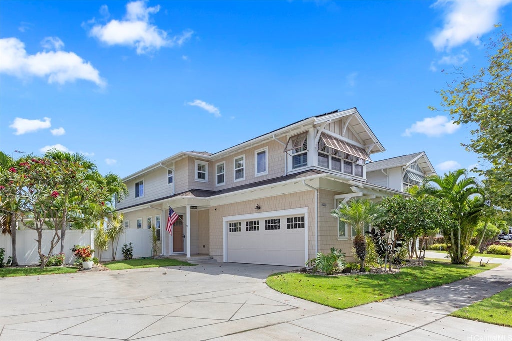 PRICED TO SELL! Eliminate the need to compromise! Experience the perfect blend of resort-style living and modern comfort in this beautifully maintained 4-bedroom, 3-bath home, ideally situated along the 14th fairway of the Hoakalei Country Club. With sweeping golf course views, 24 owned PV panels with 2 Tesla Powerwall batteries, and thoughtful upgrades throughout, this is one of the most compelling offerings in the neighborhood. The spacious layout includes a large upstairs primary suite and a coveted first-floor bedroom with full bath—perfect for guests or multigenerational living. The gourmet kitchen boasts granite countertops, stainless steel appliances, an oversized island, and generous storage, all flowing seamlessly into the open-concept living and dining spaces. Additional highlights include central AC, solar water heater, engineered hardwood flooring, new gutter system, plantation shutters, custom closet systems, and a versatile upstairs loft. This is your opportunity to own a golf course property at an unmatched price.