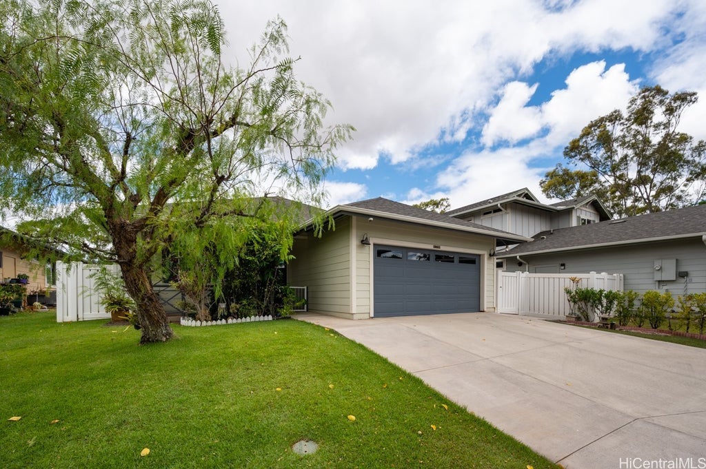Golf Villas at Lokahi Greens – Your Paradise Awaits! Nestled in a cul-de-sac, this beautifully maintained single-level 3 bedroom, 2 full bath home blends comfort, efficiency and style. With 16 owned solar panels on a net-metering system, you’ll enjoy energy savings while living sustainably. Inside, high ceilings and an open-concept layout create a bright, airy feel. Luxury vinyl plank flooring flows through the main living spaces, while the kitchen features Corian countertops. Additional highlights include central air, split A/C in the primary bedroom, carpet in bedrooms, ceiling fans, plantation shutters, custom window treatments and a large walk-in laundry room with cabinets. The garage offers an EV charger, workspace and a tankless water heater, plus a solar attic fan for efficiency. The home has vinyl and aluminum fencing for privacy and an extended concrete driveway adds extra parking. Relax in the backyard with no rear neighbors as the home backs directly onto the 17th fairway of Ewa Villages Golf Course. Minutes from Ka Makana Ali’i Shopping Center, Kroc Center, Post Office, dining and entertainment-this home offers both convenience and tranquility. A must see to appreciate!