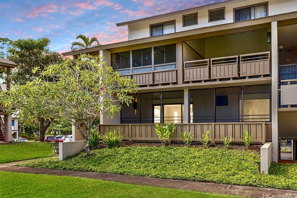 Outstanding!!! This spacious and freshly updated single-level, first-floor townhome boasts 2 bedrooms and 2 baths with recent upgrades to include fresh paint, all-new flooring, a brand-new range and microwave, sleek quartz countertops with a new sink, reglazed tubs and surrounds, and a new water heater—ready for you to move in without a worry. The open, airy layout features a separate dining area and an expansive living room that flows effortlessly to a huge screened lanai, perfect for entertaining and indoor-outdoor living. Step outside to a fenced garden area and lush greenery views. Both bedrooms are generously sized, with the primary suite offering a walk-in closet. This end-unit gem includes two covered, side-by-side parking stalls and a large private storage room. Residents enjoy access to a beautiful swimming pool and a recreation room for gatherings or meetings, all within a highly sought-after tropical community adjacent to Mililani Golf Club and its restaurant. You'll also have membership in the Mililani Town Association that provides access to seven recreation centers and a host of amenities.