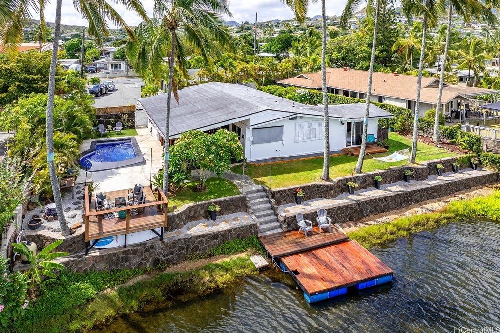 Live, Love, Lake Life! This delightful and well maintained 3 BR/2 BA, single-family home combines comfort, style and outdoor adventure. Features include eucalyptus hardwood flooring, striking rock walls, a charming grotto with a relaxing soaking tub, and a sparkling tiled pool—all set amidst a spacious and lush lot with mature landscaping. The updated kitchen and fresh interior and exterior paint complement the home's appeal, while the covered lanai offers an ideal space for outdoor dining and relaxation. The primary suite features 2 generous walk-in closets. Throughout the property, you'll find multiple inviting lounging areas, perfect for unwinding or entertaining friends. A grassy open space provides a safe, fun area for all little ones to play freely. Kayak right from your back door adding adventure to daily life. Located close to popular restaurants and minutes from the world-famous 3-mile Kailua Beach, this home offers a lifestyle that effortlessly blends comfort, convenience, and breathtaking mountain and lake views. Whether you're savoring the tranquility of your lakeside retreat or exploring the vibrant community, this home truly embodies the spirit of Hawaiian living.