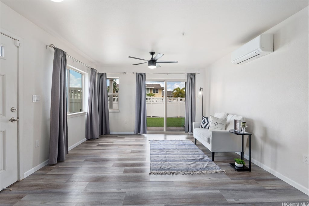 **NOW OFFERING** Price adjustment + $10K credit to the buyer! Sleek and stylish modern living awaits you in Olino at Mehana! This rarely available single level ground floor unit features vinyl plank flooring throughout, a spacious low maintenance backyard with astroturf, a walk-in closet in the primary bedroom, and you'll always stay cool and comfortable with a split A/C unit and ceiling fan in every room. Spend your days cooking up meals in your beautiful open kitchen with slate appliances or hosting outdoor parties in your fully fenced backyard. Or take a short neighborhood walk to enjoy all that Mehana has to offer including swimming pool, fitness room, plus multiple parks and playgrounds. You'll love being conveniently located in the heart of Kapolei close to shopping, restaurants, on/off freeway access, and more - nearly everything is close by. The epitome of easy living is found here so don't miss out and come home today!