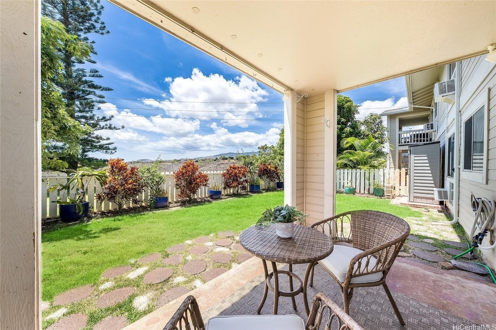 Back on market! (Previous buyer canceled due to government shutdown.) This single level ground floor 2-bed, 2-bath, 2-parking home sits on the perimeter of the project with a large yard lined with mature landscaping. Tucked in a private corner of the project overlooking the gulch, it feels open and peaceful both inside and out. The unit has been fully remodeled with luxury vinyl plank floors, stone counters, shaker cabinets, and intentionally chosen fixtures and shelving that pull the entire design together. Parkglen at Waikele is a non-congested project in a setting that combines privacy with space...this home is a rare find at this price point.