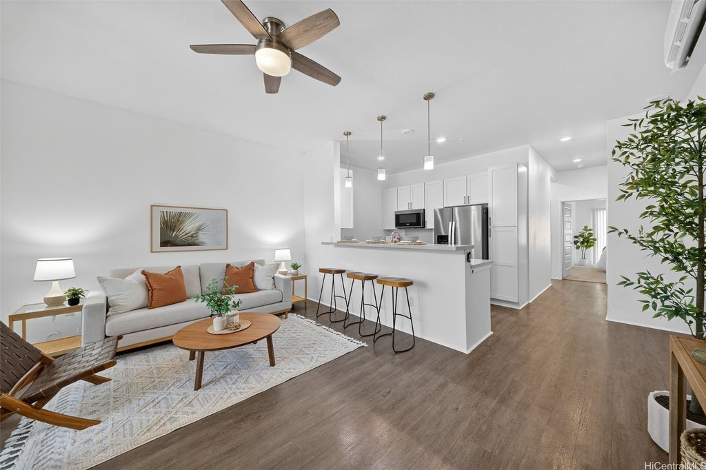 Freshly painted and ready for its next owner, this ground-floor Kohina Phase 2 unit offers 2 bedrooms, 2 full baths, and 2 assigned parking stalls. The open layout features vinyl flooring in the living areas, kitchen, and bathrooms, with carpet in the bedrooms for comfort. Split AC units in the living room and both bedrooms keep the home cool year-round. The primary suite opens to a small, private yard with street access—ideal for relaxing or enjoying a morning coffee. Situated near UH West O‘ahu, Ka Makana Ali‘i, the Kroc Center, freeway on-ramps, and rail and bus stops, the location is as convenient as it gets. A standout feature is the VA loan assumption option at a 3.75% interest rate (Freedom Mortgage, approx. $490,000 balance), providing a rare financing advantage.