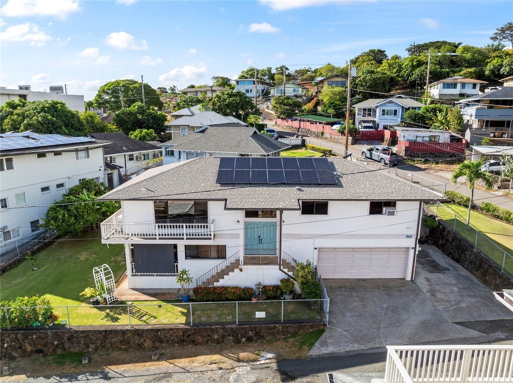 Versatile Dual-Living 4-Bedroom Home with Ocean & Skyline Views Welcome to this beautifully maintained 4-bedroom, 3-bathroom home offering exceptional dual-living potential on a desirable corner lot. Thoughtfully designed, the upper level features 2 spacious bedrooms, a versatile den (ideal for a home office or guest room), and 2 full bathrooms. The lower level includes a separate 2-bedroom, 1-bath layout—perfect for extended family, guests, or rental income. Enjoy breathtaking ocean and skyline views from the expansive wrap-around balcony, ideal for entertaining or relaxing with a sunset backdrop. The home is surrounded by lush, manicured landscaping and vibrant tropical flora, including hibiscus, puakenikeni, ginger, and fruit trees. Sustainability meets convenience with a solar water heater, 14 leased PV panels, 2 owned Tesla batteries, and an EV charger—keeping energy costs low and eco-conscious living effortless. With 6 on-site parking spaces and impressive curb appeal, this property offers both practicality and style. Ample green space provides room to garden, play, or unwind, making this a true island sanctuary with modern amenities and multigenerational flexibility.