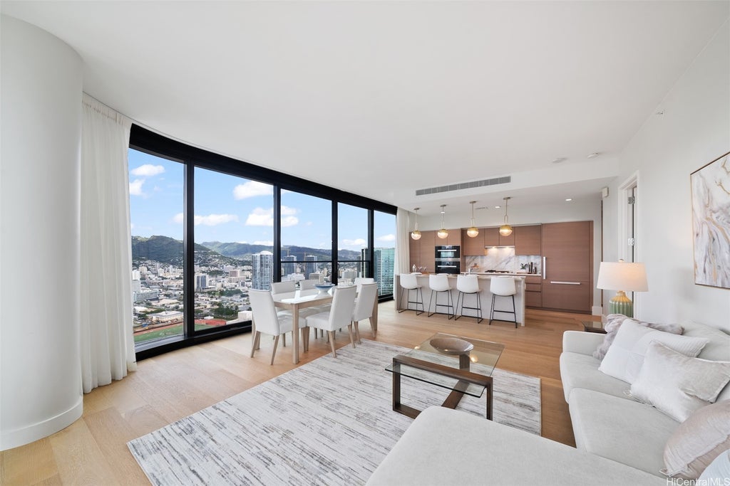 Ward Village's Anaha condominium presents an exceptional opportunity for luxury living. This penthouse corner unit boasts breathtaking panoramic views of the ocean, city, and mountains, thanks to its expansive floor-to-ceiling windows. The unit features a spacious 10-foot ceiling, sleek hardwood flooring, and high-end Studio Becker Cabinets. Cooking is a delight with top-of-the-line Miele appliances and elegant quartz countertops. Additional highlights include a convenient storage locker and a side-by-side parking spot on the first floor. Residents can enjoy resort-like amenities, perfect for relaxation and entertainment. Located across from Whole Foods and just steps away from dining, shopping, and more, this unit offers both convenience and sophistication