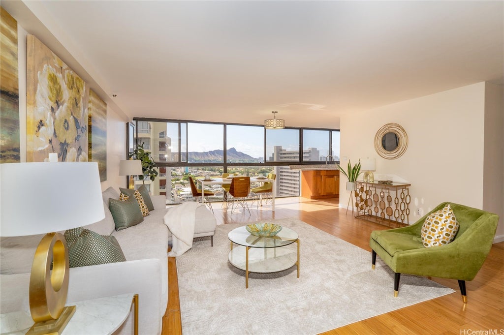Spacious open floor plan 2-bed,2 bath, breezy corner unit 2 assigned (tandem) FEE SIMPLE. Ready to move in!!! Diamond head, Waikiki, city, and some ocean views. Renovated/Upgraded 2019: Floor, Kitchen, Bathrooms, NO POPCORN CEILING. Washer and dryer in the unit. Newer Glass top stove, Dish Washer, refrigerator. Newly Re-Pipe the whole building. Kings Gate equipped with fire sprinkler system. Onsite resident manager. Convenient location! Close to University of Hawaii/ Moiliili/ Ala Moana/ Waikiki area. Other assessment $266 will be end by Dec.2025