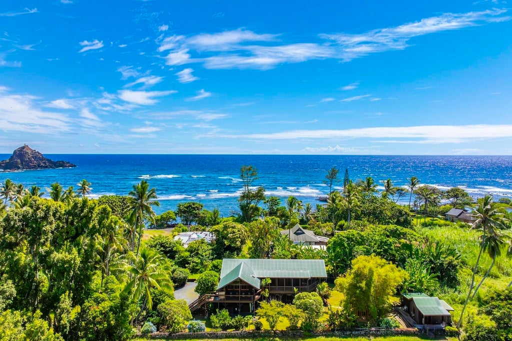 This truly one-of-a-kind home, located within walking distance of the iconic Hamoa and Koki Beaches, rests on half an acre, yet feels like a world of its own. The open-beam kitchen and living area are bathed in stunning views of the rolling green hills that rise up toward Haleakala, immersing you in the natural beauty of Hana, Maui. With uninterrupted vistas across 29 acres of preserved State land, the sense of space and serenity is unparalleled. Expansive decks, some screened-in, wrap around the upper level, offering the perfect setting for indoor-outdoor living—the true Hana lifestyle. Warm teak and maple floors complete the home’s inviting atmosphere. Guests will enjoy the downstairs space or the Ohana, with its quaint and unique charm. Here, time stands still, and the soul finds rest, while nature and tranquility surround you.