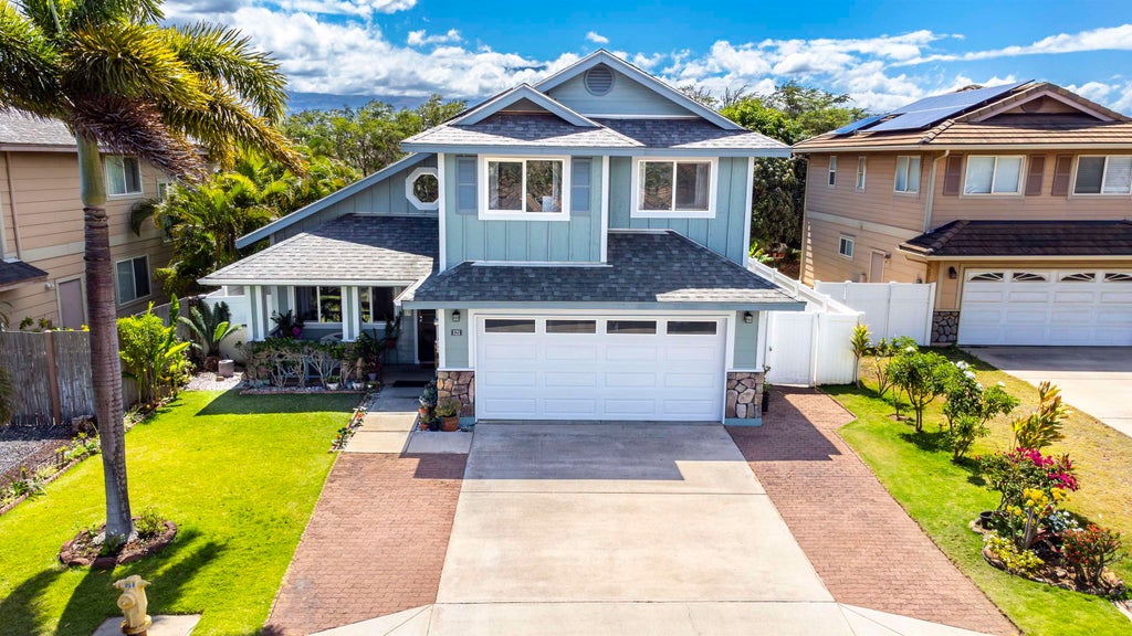 Nestled in the coveted neighborhood of The Legends at Maui Lani in Kahului, this two-story, single-family residence features 4 bedrooms and 2.5 bathrooms, with the primary suite conveniently located on the ground floor. As you step inside, you'll be captivated by the vaulted ceilings and expansive living room, creating a welcoming and open atmosphere. Central air conditioning ensures year-round comfort, while 27 owned photovoltaic panels, two Tesla backup batteries, and a solar water heater offer sustainable energy solutions, enhancing the home's eco-friendly appeal. The heart of this home is its homely kitchen, equipped with stainless steel appliances, lots of cabinetry and a breakfast bar, perfect for casual dining. The adjacent dining alcove and bonus living room provide an ideal setting for intimate meals and family gatherings. Also on the main floor, you'll find a large primary bedroom suite with brand new carpets complemented by a generous walk-in closet. The opulent ensuite bathroom, features double sinks, a renovated stand-up shower, a bathtub with shower head and water closet for privacy. Down the hall from the primary suite is the pantry/linen closet, the laundry closet equipped with Samsung washer & LG dryer, a deep under-the-stairs storage closet, and a half bathroom add to the home's storage and functionality. Upstairs, three guest bedrooms with mountain views, a full bathroom, a linen closet, and a convenient office or crafting nook offer flexible spaces for work or leisure. All carpet on the stairs and upstairs were also just replaced. The meticulously maintained landscaping surrounding this home offers a delightful array of fruit-bearing trees, colorful flowers, aromatic herbs, various ornamental plants, and a water feature, creating a lush and inviting outdoor environment. Step outside to a private oasis in the backyard, a fully-fenced retreat with a covered patio where the owners enjoyed outdoor grilling and cooking almost every night and have hosted many of gatherings. The wide driveway leads to an attached garage, providing ample parking and storage solutions. The home was re-painted this year adding to the home's curb appeal. Directly across from the home is a scenic walking path, perfect for enjoying Maui's natural beauty. This residence is ideally situated near Pomaika'i Elementary School, the expansive Central Maui Regional Sports Complex, and local favorites like Fuego Argentinean Restaurant and The Dunes at Maui Lani Golf Course and driving range. Your dream home in The Legends at Maui Lani awaits, inviting you to experience the best of Kahului living.