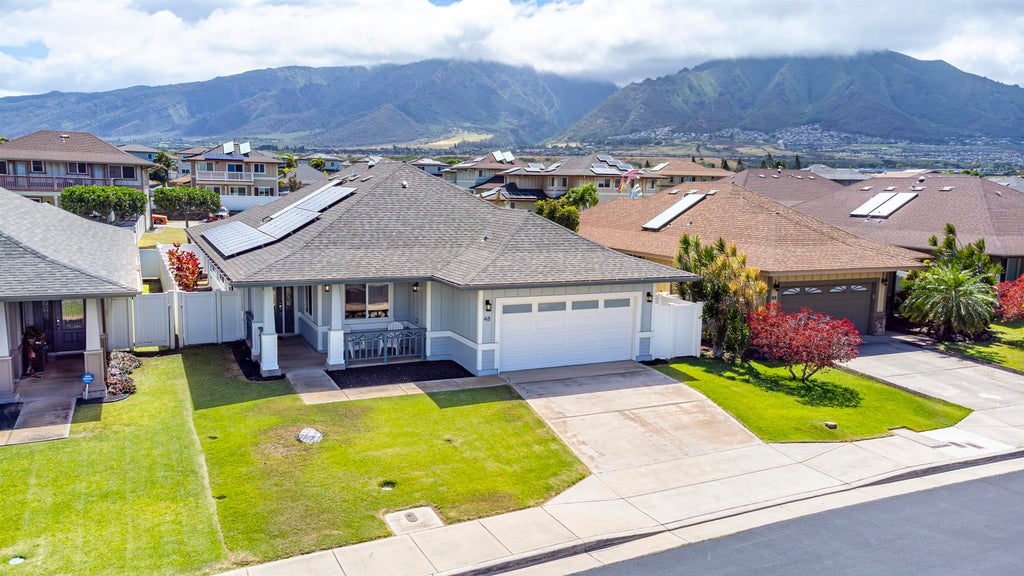 Discover the ease of one-story island living at its finest in this stunning single-level home, meticulously cared for, and located in the highly desirable Na Hoku at Maui Lani neighborhood. Offering 1,832 square feet of thoughtfully designed one-level living space, this residence features 3 bedrooms and 2 bathrooms partially furnished with inventory! The home has also been recently painted inside and out, ensuring a fresh and move-in-ready experience. Step inside and be greeted by a light and airy open floor plan, enhanced by vaulted 9-foot ceilings that create a wonderful sense of spaciousness and distinctive architectural arches that add character and charm. The living areas flow seamlessly to the dining area and open kitchen, a true highlight boasting brand new, high-quality stainless steel appliances, elegant Corian countertops, stylish wood cabinetry, a convenient large pantry, and a bright eat-in area on the kitchen island ideal for casual meals. You'll also appreciate the ample storage options and thoughtful built-in shelving found throughout the home, keeping everything organized and easily accessible. Tasteful recessed lighting enhances the atmosphere throughout the house. The primary bedroom is complete with a luxurious ensuite bathroom featuring a separate walk-in shower, a relaxing soaking tub, and double vanities. Wake up to the beauty of the island with picturesque mountain views available from the bedrooms, creating a serene and tranquil atmosphere. You'll also find a sizeable home office, offering ample space for productivity, creative pursuits or a potential fourth bedroom. Extend your living space outdoors into the tranquil fenced backyard, with a covered patio and low-maintenance landscaping. The home's attractive curb appeal is enhanced by rain gutters and a well-maintained front yard. Enjoy modern conveniences including central AC, an in-house laundry room equipped with a washer and dryer, and an attached garage with direct access. Embrace sustainable living and significant energy cost savings with the benefit of 20 photovoltaic solar panels featuring net metering and a solar hot water heater. For environmentally conscious buyers with electric vehicles, you'll appreciate the convenience of the installed automatic EV charging station. This residence is ideally situated near Pomaika'i Elementary School, the expansive Central Maui Regional Sports Complex, and local favorites like Fuego Argentinean Restaurant and The Dunes at Maui Lani Golf Course and driving range. Your dream home in Na Hoku at Maui Lani awaits, inviting you to experience the best of Kahului living – beautifully maintained and ready for you!
