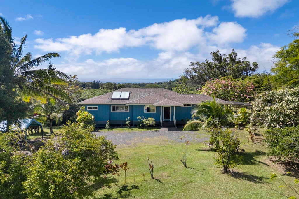 Experience the ultimate in privacy and natural beauty on this stunning 2.2-acre tropical oasis, just 30 minutes from the airport and a short drive to waterfalls and pristine North Shore beaches. This mostly level property offers breathtaking ocean and Haleakala views, framed by mature landscaping and an abundance of fruit trees. Thoughtfully designed and well cared for, the three-bedroom, three-bath residence is composed of two distinct wings. The main home features two bedrooms and two baths across 1,436 square feet, with hand-scraped hardwood floors, granite countertops, cherry wood cabinetry, and spacious covered lanais that invite indoor-outdoor living. Each room is oriented to capture the serene views. A covered 250-foot walkway connects the main home to a fully permitted one-bedroom, one-bath guest suite. This private 640-square-foot retreat includes a living room, kitchenette, and its own laundry—ideal for guests, extended family, or rental potential. This is unit A of a 2-part CPR.