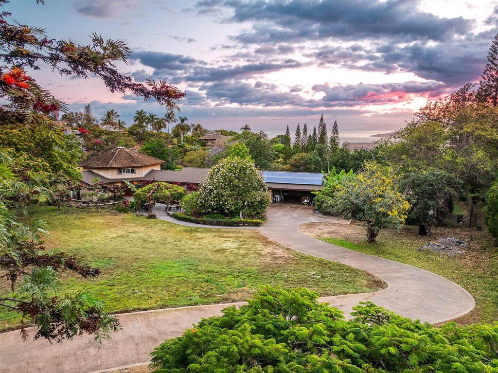 Welcome to Kula Glen, one of Upcountry Maui’s most prized neighborhoods. Situated in the “goldilocks” climate zone at 2,000 feet elevation, sunny mornings melt into cool evenings for relaxed indoor-outdoor living. Step inside the spacious great room and take in the soaring vaulted ceilings and heart of the home: the kitchen with a massive center island for prepping, serving, and catching up while everyone gathers around. Multiple lanais, both covered and open-sky, invite you to relax into the Upcountry air and serenity. The flexible layout features three bedrooms and three baths in the main residence, plus an attached two-bedroom, one-bath area with a separate entrance—ideal for guests or extended family. A tiny home and tentalow are tucked away at opposite ends of the property. The owned 30-panel PV system with battery backup keeps energy costs down. The iconic monkeypod tree offers shade and presence, while towering mock orange hedges frame this private oasis. Raised rock-wall garden beds await your herbs and vegetables. Mature fruit trees include fig, avocado, citrus, mango, and apple bananas, complemented by ornamentals like hibiscus, green jade, plumeria, ylang ylang, and roses. Easy access to the Upcountry farmers markets, schools, and restaurants—20+ minutes to the airport and North Shore beaches.
