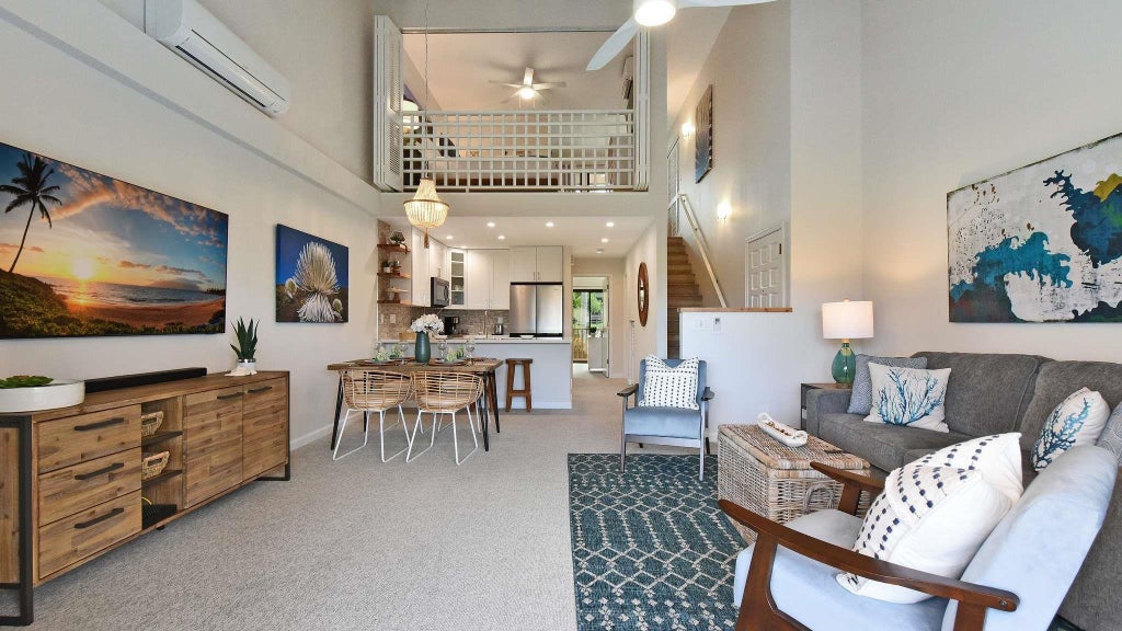Maui Kamaole is the perfect choice for those seeking to experience the best of Maui in one of South Maui’s most desirable resorts. Beautifully renovated in 2021, this condo blends modern comfort with stylish finishes in a bright, open floor plan. Indoor-outdoor living shines here with 2 floors and 3 private lanais, surrounded by lush tropical landscaping, views of the West Maui mountains, and just steps from the pools and BBQ areas. The living space is bright and airy, featuring modern updates, inviting décor, and a well-appointed remodeled kitchen with stainless steel appliances. Condo highlights include, split-zone A/Cs in the living room and both bedrooms. Sold turnkey with beautiful furnishings, 3 large flat-screen smart TVs, sleeper sofa, bath and kitchenware.. Off the kitchen, there is new full-size GE combo W/D. The upstairs spacious on-suite has king-size bed, walk-in shower, and private lanai. The main floor bedroom has two twin beds (which converts to king bed), full bathroom with tub/shower combo, and small private lanai for enjoying the morning sun. Maui Kamaole is a tropical oasis; surrounded by lush green foliage and tropical flowers its soothing to the senses...relax on your lanai, go for a swim in one of the resort-style pools, or exert some energy on one of the onsite tennis courts...its all for you to have and enjoy! This property is an ideal vacation retreat, second home, or full-time residence—and is currently part of a vacation rental program. This property is zoned Apartment (A-1) and is permitted to be used as a transient vacation rental pursuant to Maui County code chapter 19.12.20 section G, however, please be aware this permitted usage per Maui County may be subject to change. Please note, Maui Kamaole does appear on the Minatoya list. And never forget, South Maui’s famous white-sand beaches and breathtaking sunsets complete the Maui Kamaole experience of paradise living! Price to sell..call your favorite realtor today for a private showing.