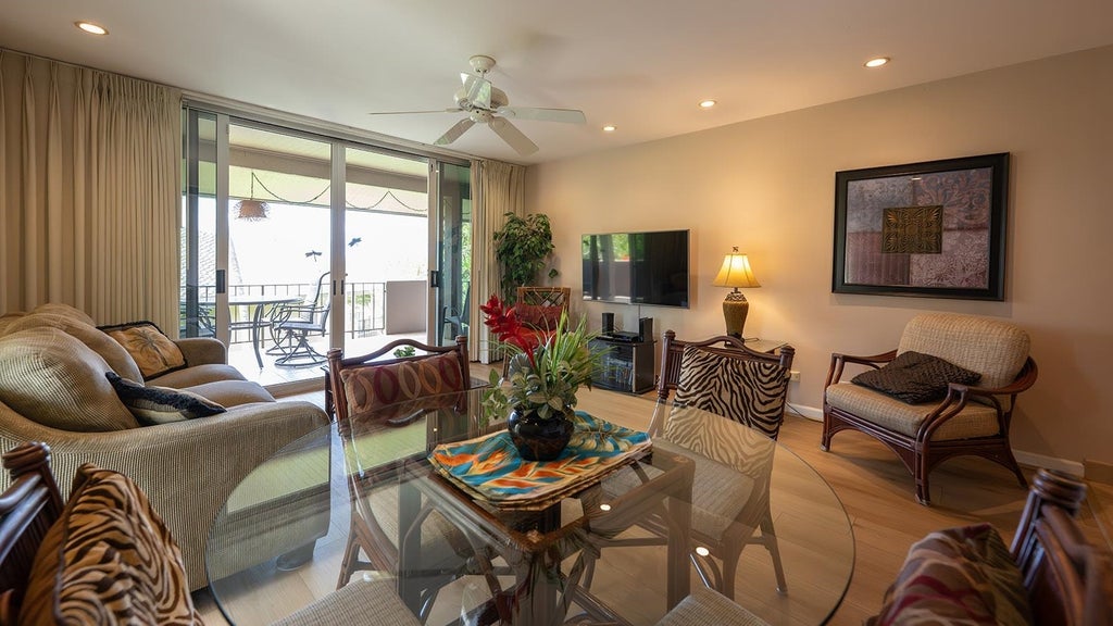 The Maui Eldorado complex is in the heart of the Kaanapali world renowned resort area, known for its beaches, its views, its golf courses, its restaurants and its island charm. The complex itself sits directly on the golf course and has a unique "cabana" that sits directly on the beach, within fifty feet of the ocean, and is reserved for the exclusive use of owners and guests. It is VERY SPECIAL. Additionally, the complex features three pools, an exercise room, an outdoor gaming area and a shuttle to escort you to the cabana or elsewhere on the grounds. And the unit itself? Arguably one of the best in the complex. With 960 interior square feet and an additional 287 square feet of livable lanai area, it has been completely upgraded (new flooring, outdoor lanais, sliders to the lanais, appliances ... including a large washer/dryer) and is one of the rarer one bedroom units that has two full bathrooms! Because this is a second floor corner unit, it enjoys the Maui sunlight streaming into two sides of the unit (giving it an even more tropical and open feeling) and yet is very private, overlooking palms, shrubbery and a grassy area. The unit is also conveniently located close to two of the three pools and the main parking areas. There is usually a reason why the good ones are priced accordingly, and one look will help you understand why this unit is fairly priced while being "simply wow"! Oh, and an added bonus ... the HOA fees include ALL utilities and, while the complex is a leasehold property, the owners have been able to purchase 10% of the land, so it is actually a 10% fee simple, 90% leasehold property. Please note that the Maui Eldorado complex is zoned "apartment" and that there is currently a County review underway regarding the continuation of short-term vacation rentals in "apartment" zoned complexes. Please discuss this matter with your Realtor for more details.