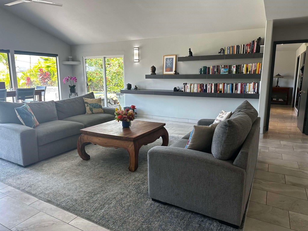 UNIQUE single-level home on well-landscaped, 1/2 acre lot. Expansive front yard with nice ocean and mountain views. Private backyard with large, tiled pool. Well-planned improvements: new rock walls at front and sides, cesspool to septic conversion, upgraded A/C, upgraded electric, 52 solar panels with net metering, new roof and more. Separate 2 car garage with full bath and guest room. Additional parking in 3 stall carport. Make sure and see this home—it is fantastic as is, but if expansion is on your mind, this is an ideal opportunity! Seller is a licensed Realtor in Hawaii.