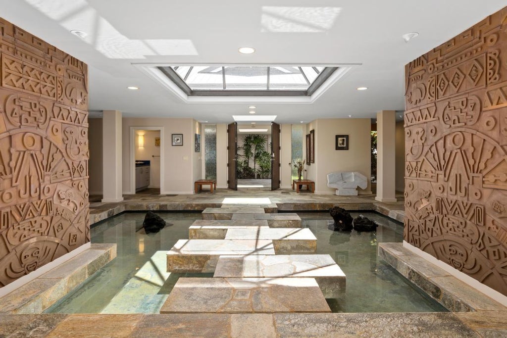 As you enter, be greeted by the soothing sound of flowing water from the indoor feature, adorned with vibrant koi swimming gracefully in their pond, adding zen to your everyday life. The Polynesian-inspired wood beam ceilings elevate the ambiance, invoking a sense of timeless elegance and exotic allure.